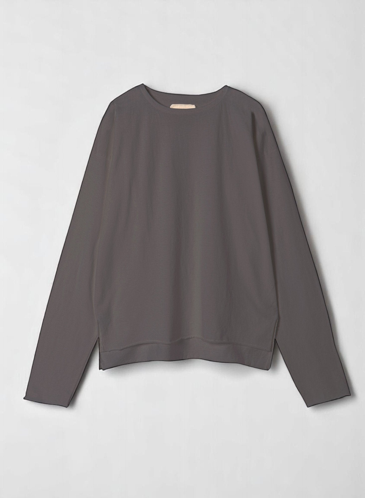 Basic Drop Shoulder Boat Neck Long Sleeve T-shirts. Raw Edges at Sleeve and Bottom opening. Stitches finish around Neck. Small side slits. 1" longer Back Body.